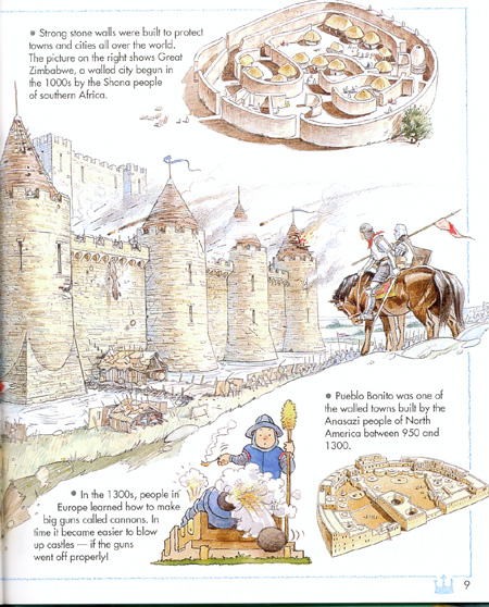 A good example of this is found in the Long Ago book, on a two-page spread that begins with the question, "Why did castles have moats." The authors answer that question, complete with illustration of said castle with said moat, then go on to describe other ways of protecting cities and settlements. As this illustration shows, the book also does a good job of describing Africa and North American during the Middle Ages. (These areas are not always discussed.) Graphics courtesy of Kingfisher