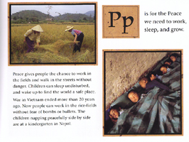 What a wonderful way to learn about other countries! The good folks at Frances Lincoln have hit on a great idea to stimulate your children's learning about other cultures and peoples of the world. Simply put, it's an ABC book in which the stars are people and things that your readers might never have heard of but should get to know as students of the world around them. These books, for readers as young as 6, take each letter of the English alphabet and apply it to some part of another culture. Each book in the series focuses on one specific country, with the exception of the first book, which focuses on the world at large. In Kathryn Cave's book W Is for World, children are introduced to other kids and cultures on every continent. In some cases (G is for Grandfather, H is for Home, N is for Name), the situations are identical to those found in young English-speakers' experiences; in other cases, the concepts are new (D is for Desert, I is for icebergs). And even the situations that seem familiar impart a message of hope and tolerance that is sure to resonate with adult readers weary of global conflict and suffering. For instance, P is for Peace. As the photo below shows, "Peace gives people the chance to work in the fields and walk in the streets without danger." Another example is "U is for Understanding the world and each other."