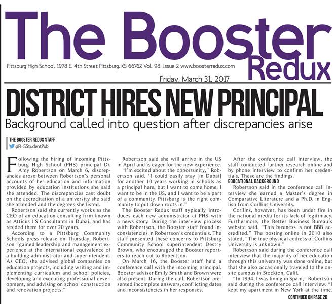 Six Kansas high school students whose investigative efforts resulted in the resignation of their school's principal will be attending the White House Correspondents' Dinner in Washington, D.C. The annual D.C. dinner, which this year takes place on April 29, is put on by the White House Correspondents' Association. The website Huffington Post invited the students and will pay their expenses. The students' advisor, Emily Smith, will accompany the students to the nation's capital and to the dinner. Pittsburg (Kan.) Community Schools hired Robertson as high school principal in March. Baden, a staffer at the school's newspaper, the Booster Redux, set out to write a profile of the new principal. Baden's initial Internet search raised some eyebrows and then some red flags, and Baden sought help from others on the Redux staff. The students discovered that Robertson's claim of earning a bachelor's of fine arts degree from the University of Tulsa was false; this was verified by the university, which said that it had never awarded such a degree. The students also discovered that the university from which Robertson said that she earned her master's and doctorate degrees, had been the subject of multiple complaints about its accreditation. Corllins University has no physical address and is known in some sources as a "diploma mill." Robertson said that she had also worked as the chief executive of Atticus I S Consultants, an education consulting firm. The students found no information about this firm in any of their investigations. In the end, the students called into question Robertson's credentials enough that she resigned as principal, on April 4, four days after the students published their findings in a front-page story in the Redux. The story found exposure in news outlets and on the Internet. The students and their teacher have since been interviewed by major newspapers and TV stations around the country. Robertson, who has lived in Dubai for 20 years, did not serve a day as principal of Pittsburg High School. Her first day was to be July 1. |