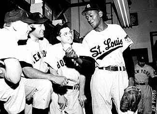 Many in America took particular notice of Paige in 1934, when he was the main pitcher on a black-and-white team that won a well-known Denver tournament known as the "Little World Series." Paige pitched three games in five days, giving up only one run and striking out 44 batters in 28 innings. In the same year, Paige played in a series of exhibition games against white Major League players. One in particular was in front of 18,000 fans in Los Angeles and featured Paige outdueling Hall-of-Famer Dizzy Dean 1-0. The game went 13 innings. Paige played in the Major Leagues for the Cleveland Indians, St. Louis Browns, and Kansas City Athletics. He also played for many other baseball teams, in the U.S, Cuba, the Dominican Republic, Mexico, and Puerto Rico. It was for the Indians in 1948 that he became, at 42, the oldest rookie in the Major Leagues. He was the seventh African-American to join Major League Baseball, and he was the teammate of Larry Doby, the first American League African-American. The Indians won the World Series that year, beating the Boston Braves 4 games to 2. Paige pitched another season for the Indians, then signed with the St. Louis Browns and played three seasons. In between Major League stints, he returned to playing in exhibition games and went on "barnstorming" tours with Major Leaguers and Negro League players, traveling the country and playing in game after game, night after night, to big crowds. Next Page: Larger than Life |