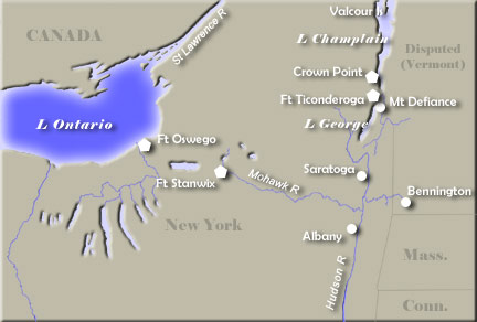 The fort, formerly named Fort Carillon, was built from 1755 to 1757, during the French and Indian War. Soldiers at the fort could control comings and goings of soldiers and traders between the British-controlled Hudson River Valley and the French-controlled Saint Lawrence River Valley. The was on the southern tip of Lake Champlain and also near Lake George. The name comes from an Iroquois word, tekontaroken, which means something similar to “junction of two waterways.” In 1758, French troops numbering 4,000 successfully an attack by British troops numbering four times that. The British returned the next year, however, and captured the fort, holding it until the surprise success of the Green Mountain Boys in 1775.