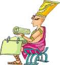 Egyptian people would use brushes and draw pictures, or hieroglyphs, on rolls of papyrus. Some of these hierogrlyphs told stories. Others stood for something else. Some hieroglyphs, for example, represented a pharaoh or a god. Others stood for a sound or a letter. We get our modern alphabet in part from these hieroglyphs. Egyptians kept records of how much grain they had on hand and how much they sold. These records were written, using brushes on papyrus. The record-keepers used symbols to stand for numbers. A single mark stood for the number 1. Two marks meant the number 2. Three marks meant 3, and so on, up to 10. This number was shown as a horseshoe. ![]() Next page > A Government of One > Page 1, 2, 3, 4, 5 |