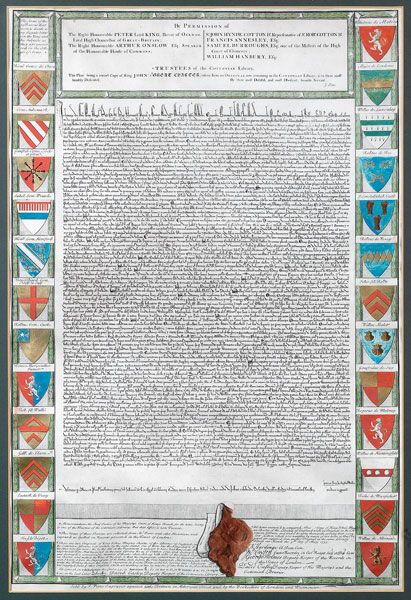 The writers of Magna Carta wrote in Latin (with English and French versions coming later). They did not divide the text into sections. The noted legal scholar Sir William Blackstone did that, in 1759. Blackstone's numbering system is still in use. One large section now called Clause 61 incorporates the medieval legal practice of distraint, allowing a committee of "enforcer" barons who could, if they deemed it vital to the eventual success of the realm, overthrow the king and seize his possessions. ![]() The barons who served as "enforcers" of Magna Carta were the following: