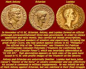 Rome continued its policy of expansion, extending again into North Africa and conquering Numidia. The victorious general in that conflict, Gaius Marius, dominated Roman politics for the next few decades. He led Roman troops to victory during the Social War, against former allies in Italy, then had a falling out with another ambitious commander, Sulla, over who should lead the fight against King Mithridates VI of Pontus. Sulla, at the head of his army, invaded Rome, had Marius declared an enemy of the state, then had himself elected dictator. He took firm control in Rome and ruled with an iron fist for a handful of years. Two allies of Sulla, Crassus and Pompey, were the powers in Rome after Sulla's death. Crassus made a name for himself by becoming the richest man in Rome and also by being the commander who finally put down the slave revolt of Spartacus. Pompey proved a brilliant warrior and tactician and won many battles in the east, bringing glory and money to Rome. ![]() A third powerful leader emerged at this time. Julius Caesar proved himself to be a successful warrior, lawyer, public speaker, and government official. He and Crassus and Pompey were the three most powerful men in Rome and agreed to rule it together as the First Triumvirate. The men became jealous of one another and set off in different directions in order to achieve more conquests for Rome. Caesar went to Gaul and subjugated it (while also making two trips to Britain). Crassus led an army in an invasion of Parthia and was killed there in combat. Pompey emerged as the sole consul in Rome and then agreed to fight Caesar when the latter crossed the Rubicon at the head of an army, in violation of Roman tradition. Caesar emerged victorious in the civil war, forcing Pompey to fleet to Egypt, where he was killed. Caesar ruled Rome alone. He was made dictator for life, an action that made many people fear that he was going to be named king. For hundreds of years, Romans had feared the return of a king, since they had such bad memories of the last king, Tarquin Superbus, the last of the seven ancient kings of Rome. A band of Senators killed Caesar. ![]() Marc Antony, Caesar's chief supporter, emerged as a powerful force in Rome and, along with the powerful deputy dictator Lepidus and Caesar's adopted son, Octavian, formed the Second Triumvirate. Jealousies flared among these three rulers as well, particularly after Antony became involved with Egypt's pharaoh, Cleopatra. Lepidus tried to steal Octavian's legions and found himself ousted from power. Antony and Octavian then fought each other, with Octavian's victory at the Battle of Actium being the death knell for Antony. Octavian then took sole control. He ended the Roman Republic when he took the name Augustus and became Rome's first Emperor. First page > The Early Years > Page 1, 2, 3, 4 |