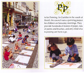 This book, B Is for Brazil by Maria de Fatima Campos, is a great little book in the Round-the-World series from Frances Lincoln. The focus here is on Brazil, and the method of learning is one page at a time, each letter of the English alphabet corresponding to one facet of the Brazilian culture that readers who live elsewhere might not know. The book begins with familiar concepts (A is for Amazon, B Is for Brazil, C Is for Carnival) but then soon moves into more (for most English-speaking readers) unfamiliar terrritory (J is for Jangada [a small fishing boat], U is for Urucum [a tree that produces both dye and powder for food coloring]). As with other books in this series, the pictures are vivid and both illustrate the accompanying words and tell their own story. On the P Is for Painting page, for example, the young reader sees kids in Brazil doing exactly what he or she might be doing on a typical day.