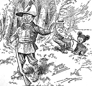 The teddy bear as we know it has been around only since the early part of the 20th Century. And, as with other famous inventions (like the telephone), it was a shared process. One of the first known appearances of any kind of stuffed toy bear was in the 1894 catalog put out by German toy company Gebruder Sussenguth. This was in conjunction with the hand-making of stuffed Things changed in 1903, when a buyer from an American toy store saw the bear at a fair in Leipzig and promptly placed an order for 3,000. This buyer saw an opportunity for capitalizing on a real-life event. The President of the United States in 1902 was Theodore Roosevelt, who liked to hunt in the wild. On a hunting trip in Mississippi, Roosevelt failed to kill a bear, so the people hunting with him found one and tied it to a tree. It would have been an easy shot for Roosevelt, who could This incident was reported in American newspapers, of course. It was particularly the subject of a cartoon by Clifford Berryman of the Washington Post. The cartoon was titled "Drawing the Line in Mississippi." The American toy store buyer who ordered 3,000 bears from Margarete Steiff definitely saw an opportunity. So did Morris and Rose Michton, Russian immigrants who created their own stuffed toy bear. They made several bears and planned to sell them. They even sent one to President Roosevelt, asking for permission to name the bear after him. They wanted to call it "Teddy's Bear." Roosevelt gave his permission, and sales took off. (In his typical modest way, he had this to say: "I don't think my name is likely to be worth much in the toy bear business, but you are welcome to use it.") The Michtons' bear was a bit different from the Steiff bear. The Michtons' bear looked more like the bear in the Washington Post cartoon; the Steiff bear looked more like a real bear. Sales of both skyrocketed after Roosevelt's "approval." Other manufacturers have come on-board through the years, and the teddy bear remains a staple of toy collections around the world.