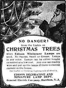 ![]() The first home Christmas lights, though, are thought to have been put up in 1882, by Edward Johnson, who was an executive at Edison's company. He put 80 red, white, and blue lights on a small tree. Businesses soon followed Johnson's lead, extending the display to the outside of buildings. President Grover Cleveland had lights put on the White House Christmas tree for the first time in 1895. General Electric bought the rights to Edison's bulbs in 1892; and in 1900 the first known ad for tree lights appeared in print, in Scientific American. The ad contains the gentle suggestion of renting Christmas lights, mainly because they were so expensive. In 1900, one string of electric lights cost $12, which would be a few hundred dollars in 21st Century money. Technical innovations brought the price down relatively rapidly, however, and the same string of lights cost less than $2 in 1914. By the 1930s, Christmas lights of an electric fashion were ever-present across America. |