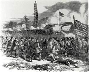 Lincoln also changed top commanders in the east again, naming Joseph Hooker to command the Army of the Potomac. Hooker's first big chance was at Chancellorsville, Va., but the result was the same as with Burnside at the helm. In the Confederate victory, however, General Thomas "Stonewall" Jackson was wounded by friendly fire. Jackson, who had enjoyed great success harrying Union troops up and down the Shenandoah Valley, died a few days later. After these two successes, an emboldened Lee took the offensive, marching his troops into Pennsylvania. Union troops, under yet another commander, George Meade, met Confederate troops near the small town of Gettysburg. During a few days in early July, 1863, the Union won two significant victories. First, Meade's troops won the day at Gettysburg, stopping the Confederate advance and inflicting significant losses on Lee's army. Secondly, Grant captured Vicksburg, giving the Union control of the Mississippi River and cutting off the western Southern states from the rest of the Confederacy. From that point on, the war by and large turned to a war of attrition, and the Union superiority in manpower and machinery came more into focus. A few months after the battle at Gettysburg, Lincoln attended a dedication ceremony at a cemetery near the battlefield. At this ceremony, Lincoln delivered a short speech that has come to be called the Gettysburg Address. In less than two minutes, Lincoln encapsulated large ideas, like the ideals on which the country was founded and why the struggle to preserve the Union was so important, and more mundane concerns, like how best to remember the soldiers who gave their lives for a cause. It remains one of the most famous speeches in American history. Next page > And in the End > Page 1, 2, 3, 4 |