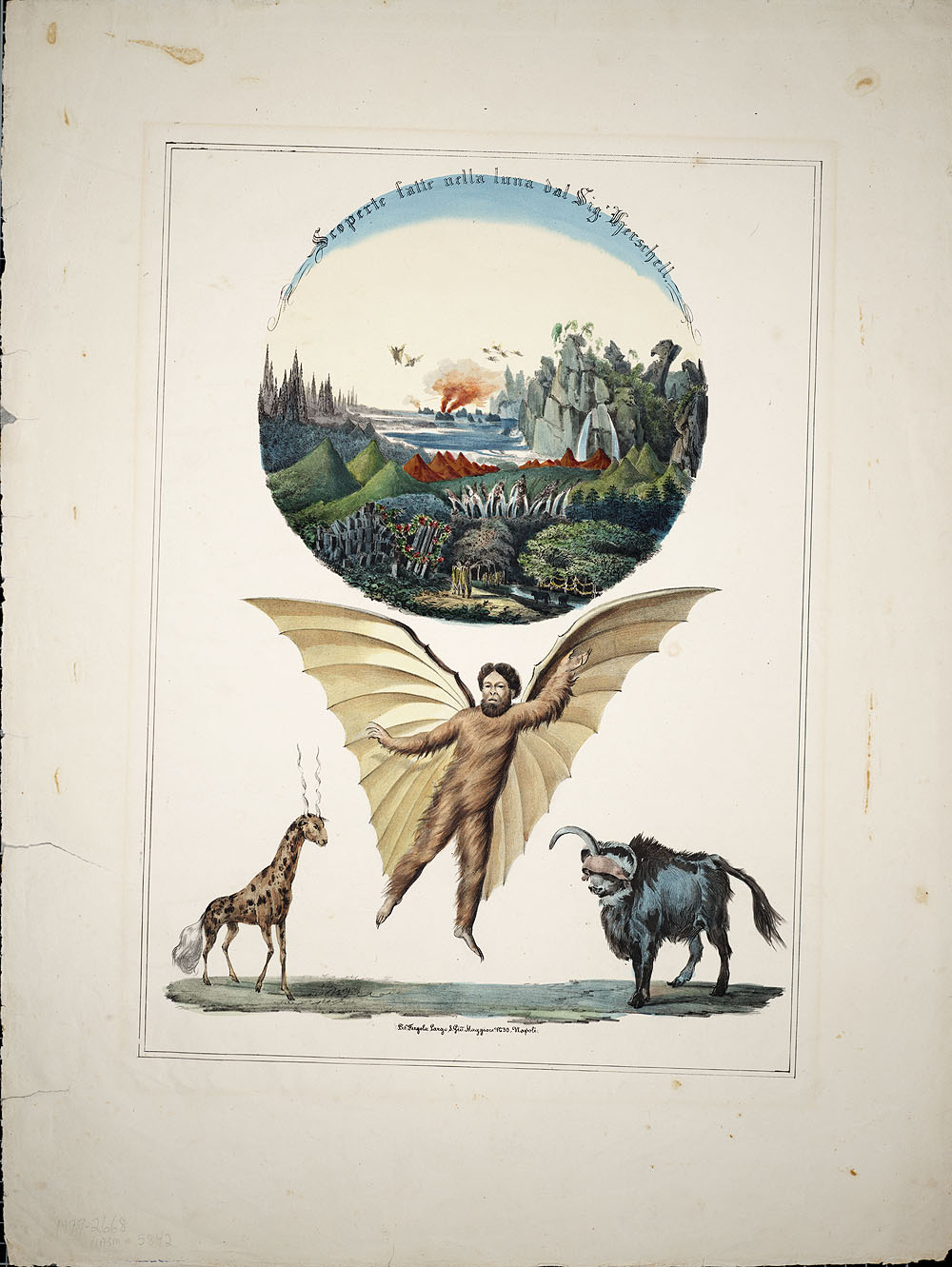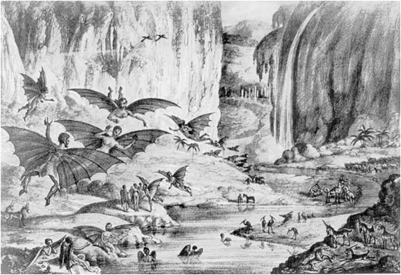 What was true was that the Edinburgh Journal of Science had ceased publication, a few years earlier. What was also true is that Dr. Andrew Grant was entirely a fiction. Another New York newspaper, the Herald, published an expose that named Locke as the author of the Moon Hoax articles and drew readers’ attention to what the newspaper said were many dubious claims in the Sun’s articles. Much later, Sun executives later admitted that they had intended the articles to be satire, particularly on other recent publications that claimed that more than 4 billion people and animals lived on the Moon. Another popular author at the time had computed exactly how many life forms the solar system contained: 21,894,974,404,480. Digesting descriptions of bearded blue unicorns, bipedal beavers, and batlike winged humanoids didn’t dissuade Sun readers from believing what they read, however. The Moon Hoax articles were published in other countries, in other languages, for more than a decade. One Italian publication also contained lithographs of Herschel’s “discoveries.” |