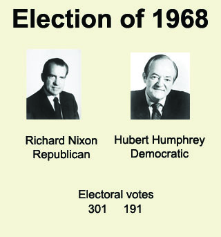The Election of 1964 The Republican Party nominated Arizona Sen. Barry Goldwater. The GOP standard-bearer didn't receive a lot of support from his party's establishment. He also had a habit of saying things that would come back to haunt him, one example being his statement not disavowing the use of tactical nuclear weapons in the war in Vietnam (where American forces were increasingly fighting against both Communist forces and Viet Cong). Johnson's campaign turned this statement into one of the most famous election campaign TV commercials ever. In the end, Johnson scored a massive victory in both popular and electoral tallies, outdistancing Goldwater by more than 15 million popular and votes and securing an electoral tally of 486-52. With the inclusion of the District of Columbia in this election, the Electoral College total was set at 538. It has not changed.The Election of 1968 Opposing him was former Vice-president Richard Nixon, who had won the nomination after something of a political comeback, vowing never to run for political office again (but changing his mind). The other high-profile candidate was Alabama Gov. George Wallace, who ran on the American Independent ticket; Wallace's major issue was opposition to racial segregation, which was a very hot topic across the country, especially in Southern states. In the end, Humphrey wore much of the blame for the continued unrest in the country. Nixon won a close popular vote tally, besting Humphrey by less than 600,000 votes. The electoral difference was starker, with Nixon winning 301-191. Wallace won five southern states and 46 electoral votes. The Election of 1972 After a contentious primary campaign, former Sen. George McGovern of South Dakota emerged with the Democratic Party nomination, besting, among others, Humphrey, Lyndon Johnson's Vice-president and the 1968 nominee. The President ran for re-election and enjoyed large amounts of support in opinion polls throughout the campaign. McGovern, already running behind in the polls, saw his stock further diminish when he had to replace his vice-presidential candidate directly after the national convention.
