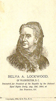 Woodhull received no votes for her candidacy. As well, she was not 35 and so would have been ineligible to serve even if she were elected. Even more significantly, she couldn't vote for herself because the 19th Amendment, granting women's suffrage, wasn't ratified until 1920. Another similar political party, National Equal Rights Party, sponsored a female presidential candidate, in both 1884 and 1888. That candidate was lawyer and activist Belva Lockwood (right). Lockwood's running mates were Marietta Stow and Charles Wells, respectively. Lockwood ran a national campaign. One source stated that she received more than 4,000 votes in 1884; no records of votes for in 1888 have been found.